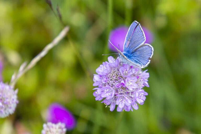 Wildbienen, Blühpflanzen und Gräser fühlen sich in diesem Naturgarten sichtlich wohl. Zum Zeitpunkt unserer Exkursion sind auf der Wildblumenwiese vorrangig Heide-Nelken (Dianthus deltoides), Gewöhnliche Grasnelken (Armeria maritima), Magerwiesen-Margeriten (Leucanthemum vulgare) und Mädesüß (Filipendula) zu sehen. Neben vielen Wild- und Honigbienen sieht man Schwebfliegen und zwei kleine Bläulinge, Hauhechel-Bläulinge (Polyommatus icarus), durch die Grashalme flattern. Andere Schmetterlinge sind, wie woanders auch, nicht zu sehen.