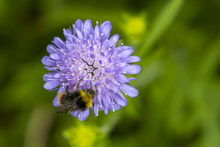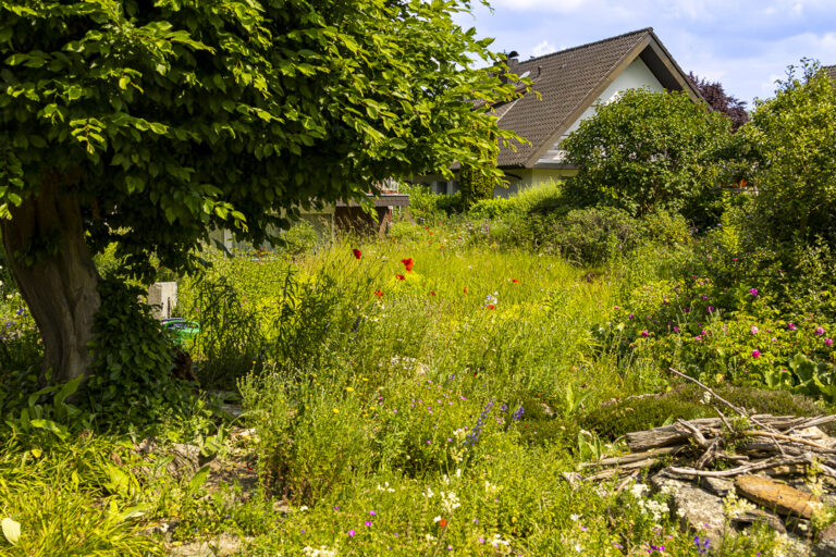 Nun aber zurück zum Naturgarten. Die Wildblumenwiese wird nur einmal im Jahr, im Oktober, gemäht, damit sich die Pflanzen durch Aussämen regenerieren bzw. verbreiten können. Allein ein kleiner und schmaler Wegestreifen rundherum wird mit dem Rasenmäher kurzgehalten.