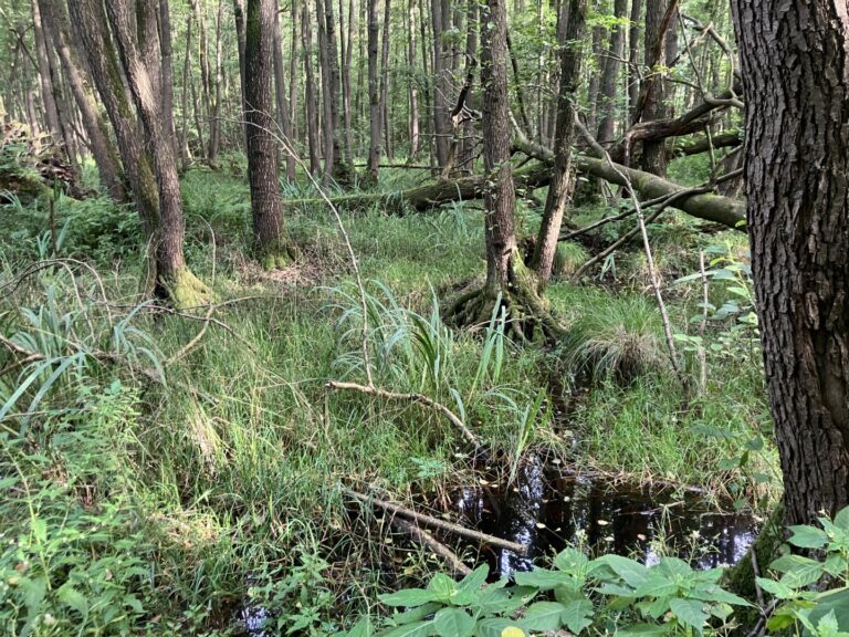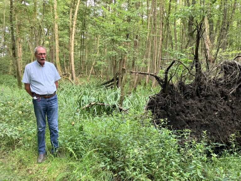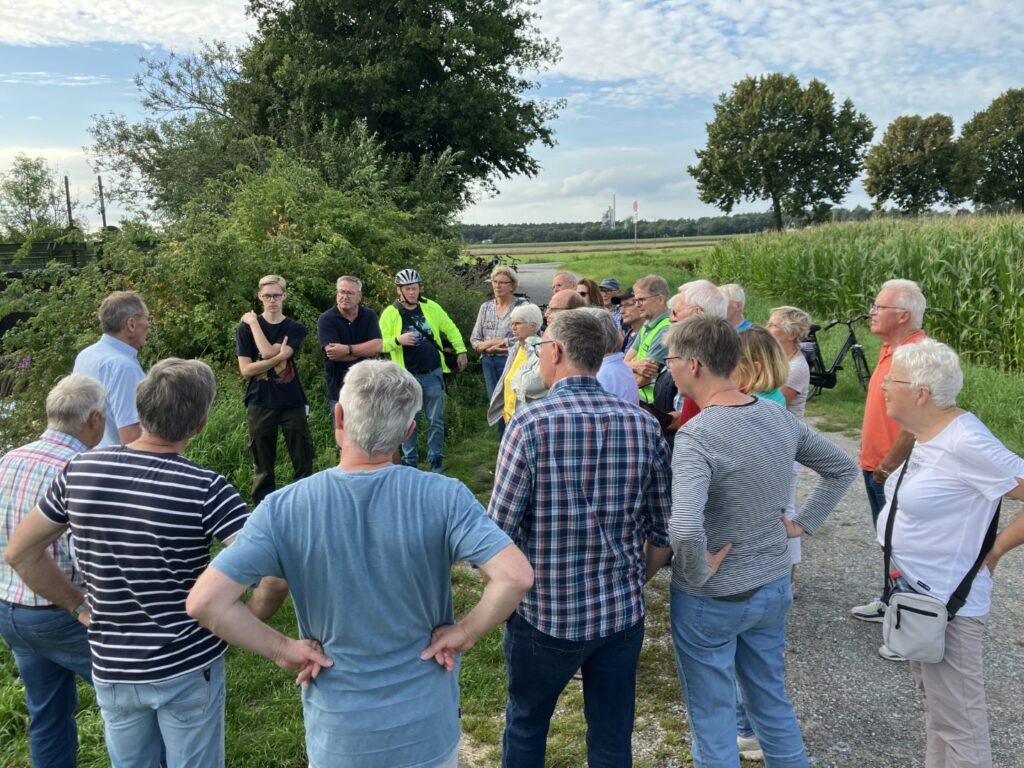 August 2023 (KB) – Zu Beginn der Klimawoche in Herzebrock-Clarholz hat die GNU am 14.08. zu einer Fahrradtour zum kleinsten und ältesten Naturschutzgebiet "Mersch" im Kreis Gütersloh eingeladen. Bürgermeister Marco Diethelm begrüßte die auf dem Paul-Craemer-Platz versammelten 25 Teilnehmer*innen. Anschließend radelten wir unter Führung von Wilhelm Gröver, dem ehem. Leiter der unteren Landschaftsschutzbehörde, zum letzten vernässten Erlenbruch im Kreis Gütersloh. Das etwas mehr als 6 Hektar große Niedermoor gehörte ursprünglich zum Hof Nordemann. Bereits vor 90 Jahren mehrten sich Stimmen in der Bevölkerung, die eine Unterschutzstellung dieses einmaligen Naturerbes forderten. Im Jahr 1948 erfolgte dann die Unterschutzstellung und leitete die spätere Eigentumnahme des Bundes ein. Auf der vernässten Fläche lebte vor 90 Jahren noch inzwischen verschwundenes Birkwild, wie einige ältere Anwohner aus ihrer Kindheit berichteten. Neben Erlen bestimmen Lilien und Seggen den Bewuchs des von Austrocknung und Überdüngung bedrohten Biotops.
