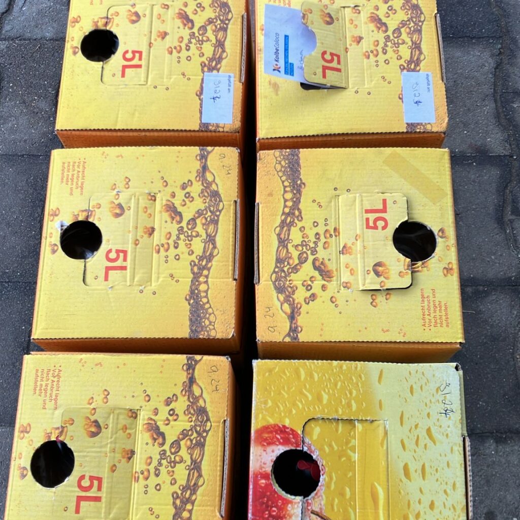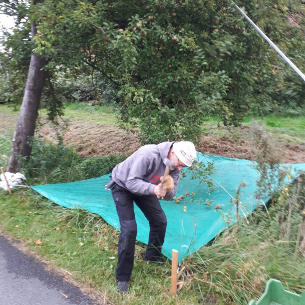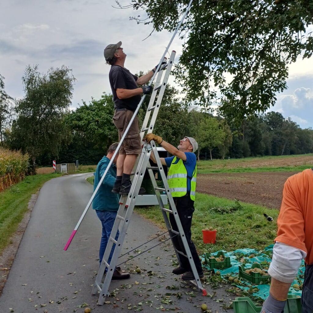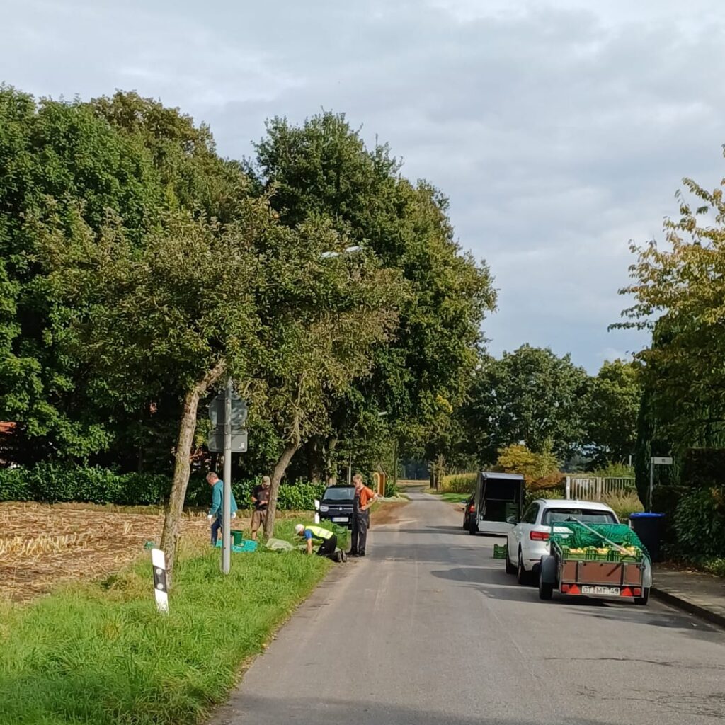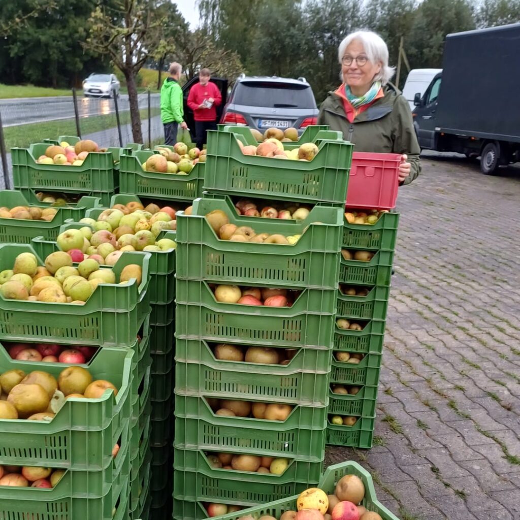 Bevor überhaupt Apfelsaft gepresst werden konnte mussten die Helfer der Lokalen Agenda erst einmal Äpfel sammeln. Die Ausbeute war deutlich höher gegenüber 2024. Waren es in 2024 nur ca. 1,5 to so hat es in 2025 gut 2,5 to Äpfel gegeben. Der Wettergott war den Obstbäumen während der Blüte wohl gesonnen. Kein Frost.