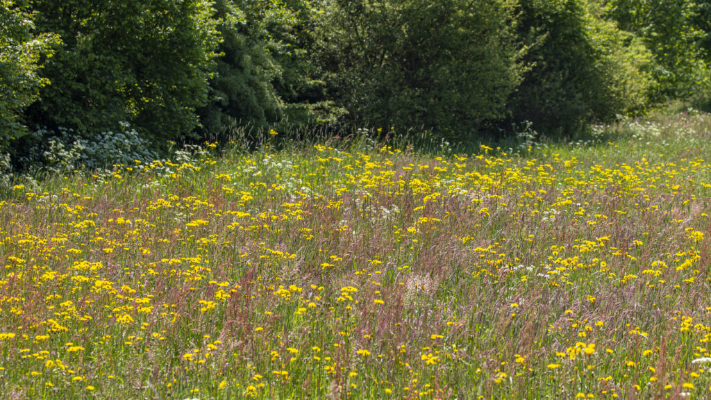 Dem mageren Angebot an Blüten im Frühjahr, Sommer und Herbst auf den konventionell bewirtschafteten Flächen bzw. deren Randstreifen will die Lokale Agenda entgegensteuern und Wildbienen und anderen Insekten auf den von ihr betreuten Flächen einen Ausgleich bieten. Die Neueinsaat im September 2019 mit Regio-Saatgut hat sich bewährt. Die C-Fläche erfreut das Auge mit bunten Blüten-Tupfern einer artenreichen gebietsheimischen Flora. Zweijähriger gelber Wiesen-Pippau (Crepis biennis), weiß-gelbe Blüten der Magerwiesen-Margerite (Leucanthemum vulgare), fransig-rosa Blüten der Kuckucks-Lichtnelke (Silene flos-cuculi), glutroter Klatschmohn (Papaver rhoeas), blaue Kornblumen (Centaurea cyanus), deren Samen Stieglitzen als Nahrung dienen, zart-rosa Acker-Witwenblumen (Knautia arvensis), rosa Sand-Grasnelken (Armeria maritima subsp. elongata), hellblaue Wiesen-Glockenblumen (Campanula patula), violettblauer Wiesen-Salbei (Salvia pratensis), rosa Wiesenklee bzw. Rotklee (Trifolium pratense), die Rote Lichtnelke (Silene dioica), rötlich schimmernder Wiesen-Sauerampfer (Rumex acetosa), gelber Wiesen-Bocksbart (Tragopogon pratensis), filigrane, weiße Blütenstände des Wiesen-Kerbels (Anthriscus sylvestris), ährige Blütenstände des Spitzwegerichs (Plantago lanceolata), im Volksmund „Butterblume“ genannter gelber Scharfer Hahnenfuß (Ranunculus acris), rosa-violette Vogel-Wicke (Vicia cracca), der gelbe Große Klappertopf (Rhinanthus angustifolius) und das Orangerote Habichtskraut (Hieracium aurantiacum) – ein nicht invasiver Neophyt – sind nur einige von rund 40 Wildpflanzenarten, die auf den Kuhteich-Wiesen gedeihen. Sie ziehen zahlreiche, darunter auch extrem seltene, geflügelte Besucher an.