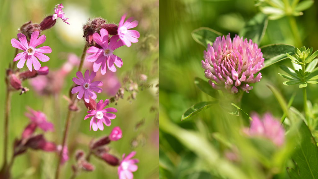 Rote Lichtnelke (Silene dioica) und Wiesenklee bzw. Rotklee (Trifolium pratense)