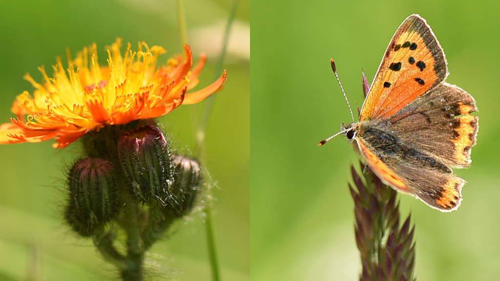 Orangerotes Habichtskraut (Hieracium aurantiacum) und Kleiner Feuerfalter (Lycaena phlaeas)
