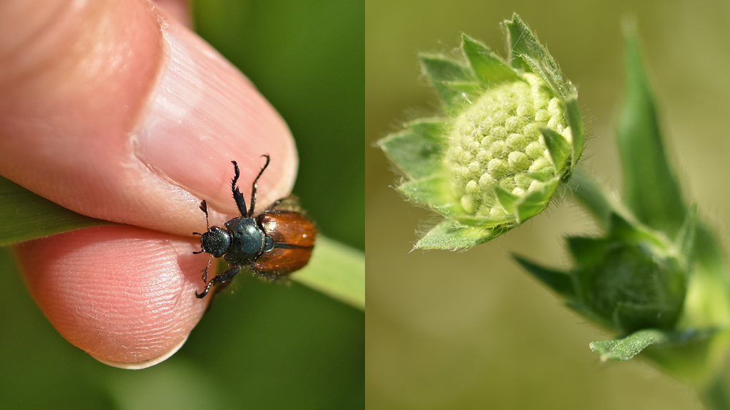 Gartenlaubkäfer (Phyllopertha horticola) und Acker-Witwenblume (Knautia arvensis) vor dem Aufblühen