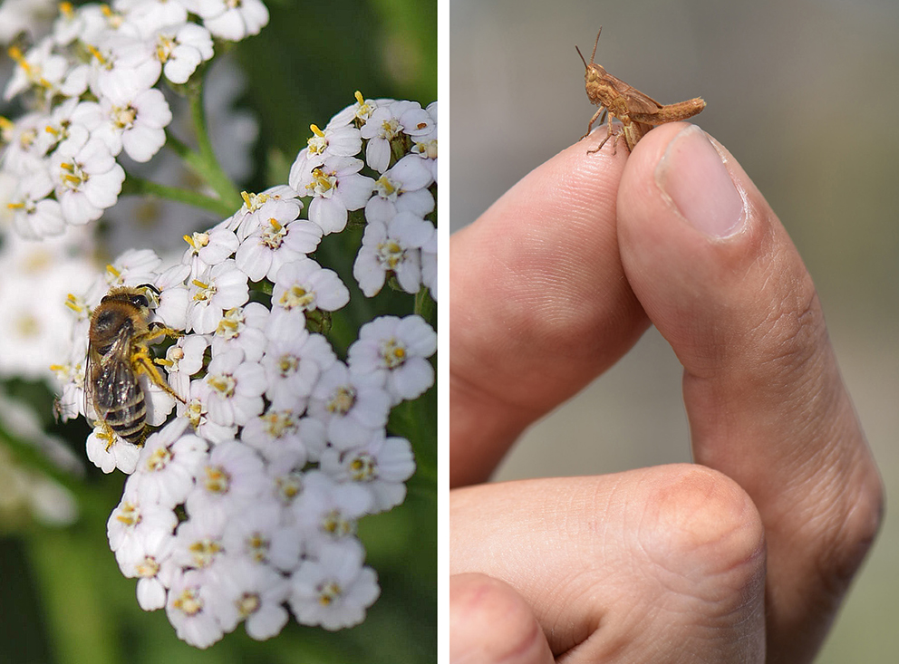 Links: Eine Buckel-Seidenbiene (Colletes daviesanus) auf Gemeiner Schafgarbe (Achillea millefolium).