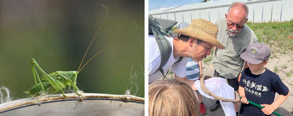 Die später dazukommenden Kinder gehen mit Keschern auf Insektenfang, um die Tiere mit seiner Hilfe zu bestimmen und sie danach wieder freizulassen. Sie bestaunen die weibliche Larve eines Grünen Heupferds am Stängel einer Ackerkratzdistel. Christian Venne erklärt den Kindern die Sinnesorgane und die Anatomie. Mit den extrem langen Antennen halten die Heuschrecken ihr Gleichgewicht oder riechen. Der gefährlich aussehende lange Stachel am Hinterleib ist die Legeröhre, die das Weibchen zur Eiablage in die Erde bohrt.
