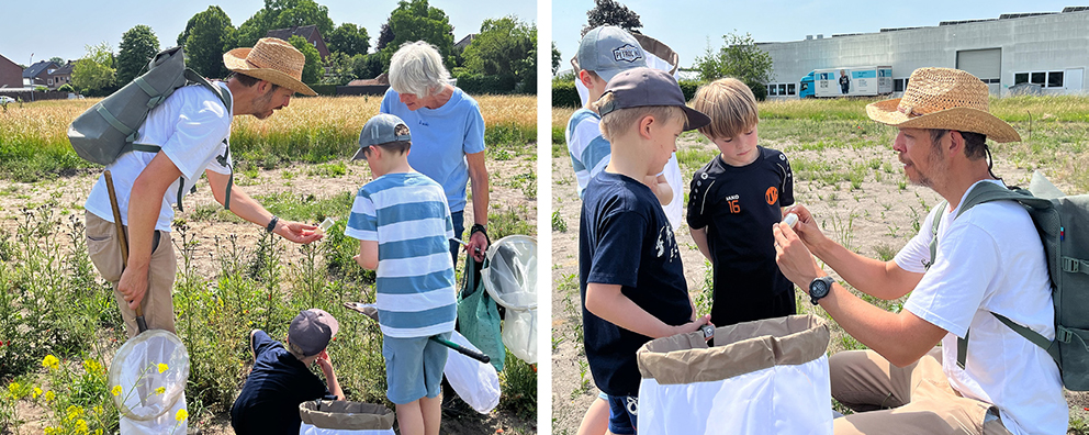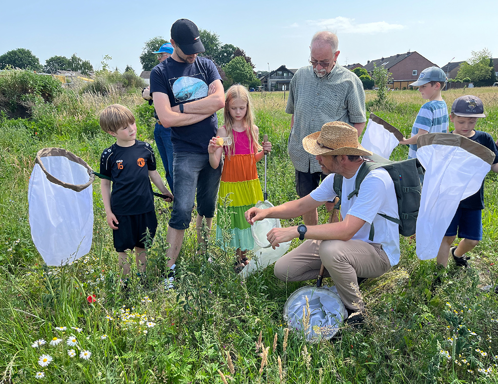Christian Venne begleitet die kleinen Insektenforscher auf ihren Streifzügen über das Gelände und erzählt ihnen Spannendes über die Lebensweise der entdeckten Insekten.