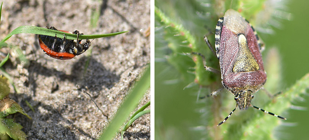 Links: Ob europäisch oder asiatisch ist auf diesem Foto nicht zu erkennen. Ein Marienkäfer hangelt sich an einem Grashalm entlang. Rechts: Eine Beerenwanze (Dolycoris baccarum), die zur Familie der Baumwanzen gehört.