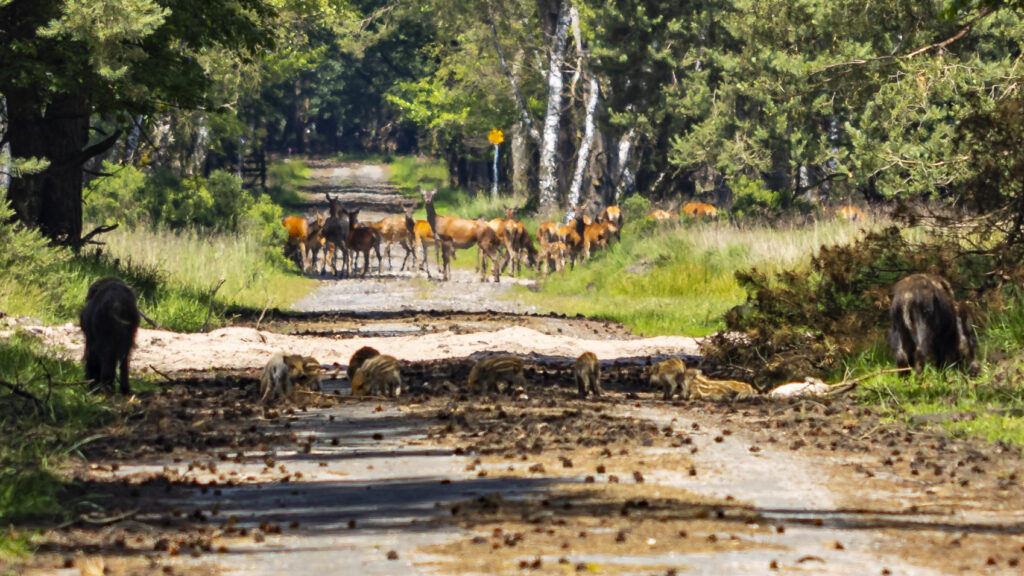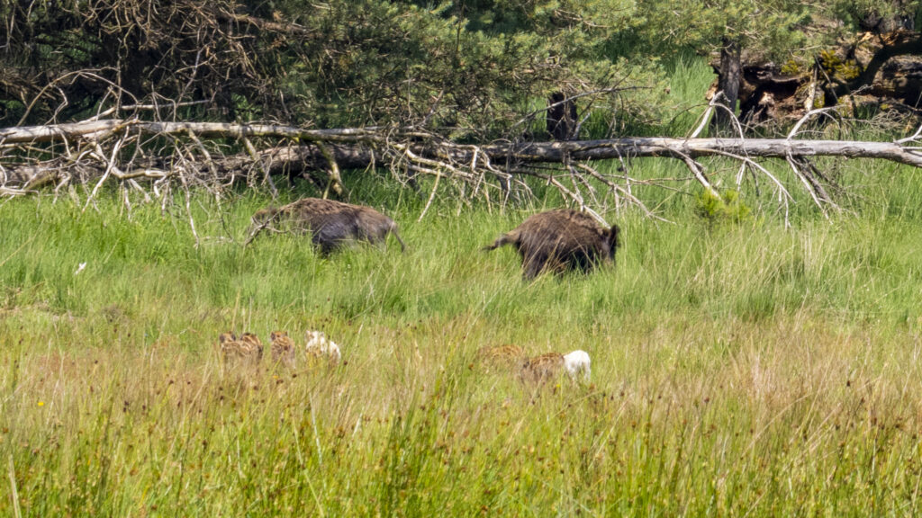Mittlerweile ist es schon gegen 13 Uhr. Wir gehen entlang einer Straße, als unser Führer plötzlich die Gruppe stoppt. Vor uns, auf 2 Uhr, zwei Wildschweinsauen mit 8 Frischlingen. Zwei der Frischlinge sind weiß. Der Wind steht gut. Sie können uns nicht wittern. Wir sind ganz ruhig, damit sie uns nicht hören. Es ist sehr spannend. Die Wildsauen kommen mit ihren Frischlingen an den Straßenrand. Wir können nicht weiter. Abwarten was passiert. Eigentlich wollen wir der Straße noch etwa 150 Meter folgen. Geht nicht. Die Schweine haben es sich am Straßenrand gemütlich gemacht. Und eine direkte Begegnung mit einer kleinen Rotte Wildscheine mit Frischlingen kann böse für uns enden. Etwa 150 Meter hinter den Wildschweinen kommen plötzlich Rotwildkühe mit ihren Kälbern an die Straße. Die Wanderung des Rotwildes nimmt kein Ende. Eine schier endlos und lang auseinandergezogene Herde kreuzt die Straße. Wir schätzen die Anzahl der Tiere auf deutlich mehr als 100 Stück. Ein gandioser Anblick. In diesem Moment ärgere ich mich ein wenig, dass ich nur eine Linse mit 100-mm Brennweite dabei habe. Nachdem das Schauspiel des Rotwildwechsels vorüber ist und die Schweine immer noch unseren Weg blockieren, gehen wir einen alternative Route, die uns auch zurück zu unseren Autos bringen wird.