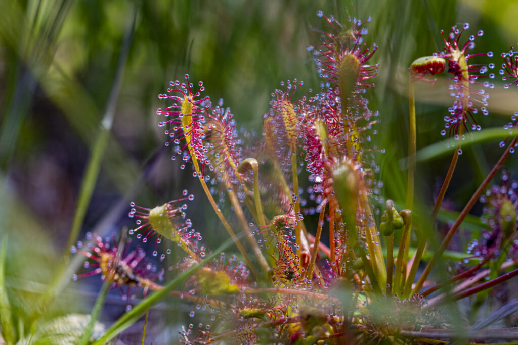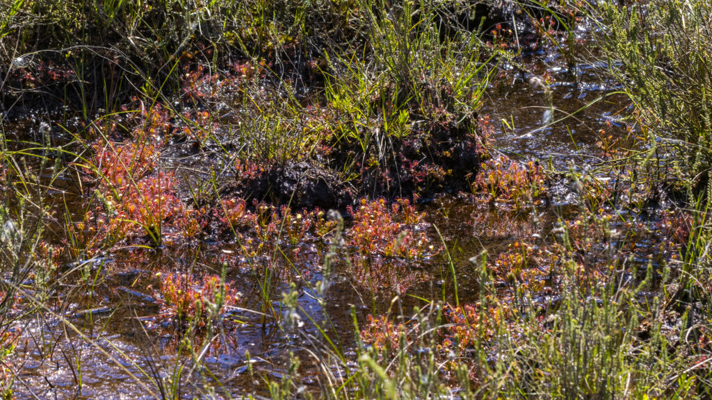 (Dactylorhiza sennia). Dazu gesellt sich an fast allen Tümpeln der Sonnentau (Drosera), eine fleischfressende Pflanze in großer Stückzahl. Immer wieder findet man auch Gagelsträucher (Myrica gale)(Rote-Liste-3-Status).