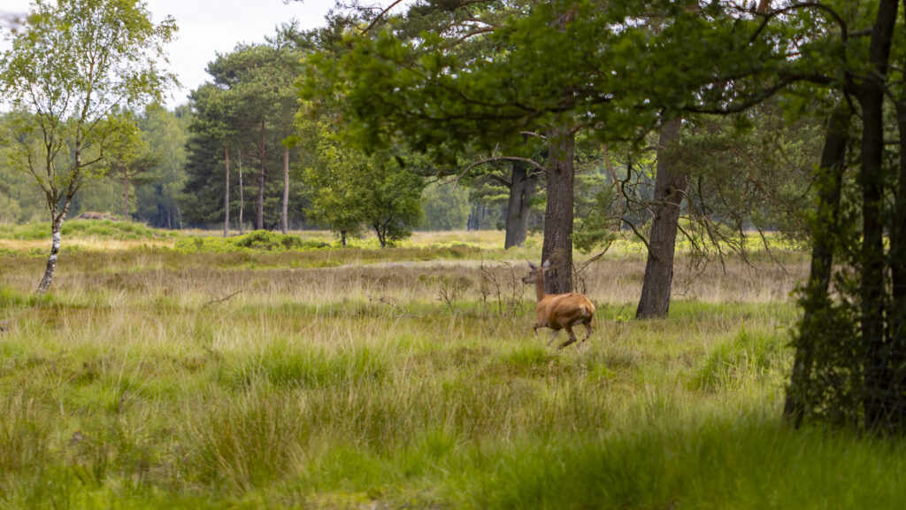 Am Startpunkt angekommen, werden die Fahrzeuge abgestellt. Es gibt noch eine kurze und deutliche Ansprache zum Verhalten bei dieser Exkursion ins verbotene Terrain. Dann geht es auch schon los. Über einen Waldweg, vorbei an einem künstlich angelegten Teich, geht es einige 100 Meter durch mehr oder weniger dichten Wald. Plötzlich stoppt die Gruppe. Ein Stückchen voraus, außerhalb des Waldes, steht eine Rothirschkuh. Als sie uns bemerkt, ergreift sie die Flucht. Es ist schön anzusehen, wie elegant dieses Tier durch das schon recht hohe Gras flüchtet.
