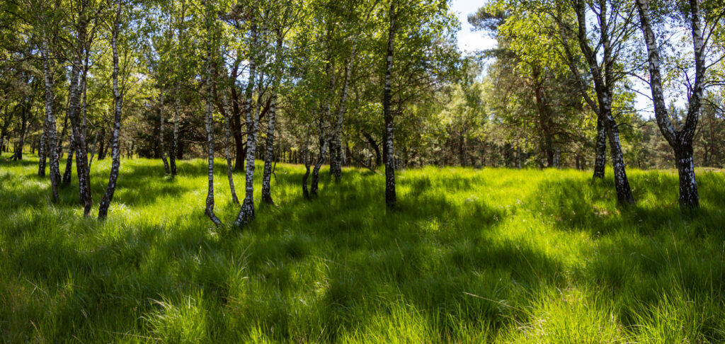 Wir verlassen den Wald und stehen inmitten von grünem Gras, rechts und links des Weges Tümpel/Teiche, auf denen sich die Libellen und andere Insekten wohlfühlen. Vor uns eine Landschaft, wie man sie in der Senne eigentlich nicht erwartet. Ein Grasmeer mit etwas Baumbestand und guter Fernsicht. Wir sehen an den Tümpeln (Moorgewässer) seltene Orchideen einer Art, die es nur hier in der Feucht-Senne gibt. Das Senne-Knabenkraut