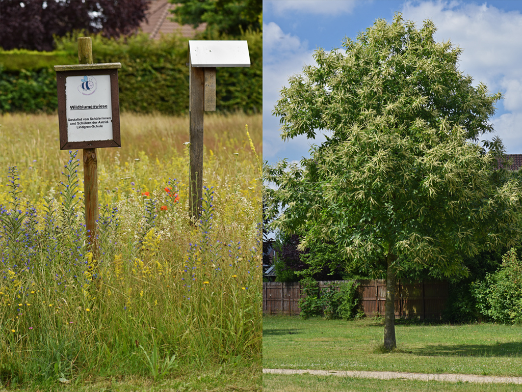 Die Wildblumenwiese auf Fläche 1 wurde von Kindern der Astrid-Lindgren-Schule gestaltet. Im Juni ist der Edelkastanien-Baum (Castanea sativa) auf der Grünfläche nebenan mit prächtigen Blütenkerzen geschmückt.