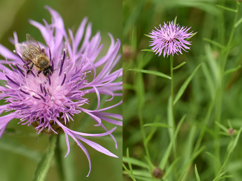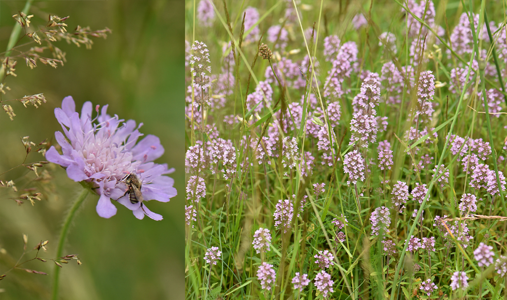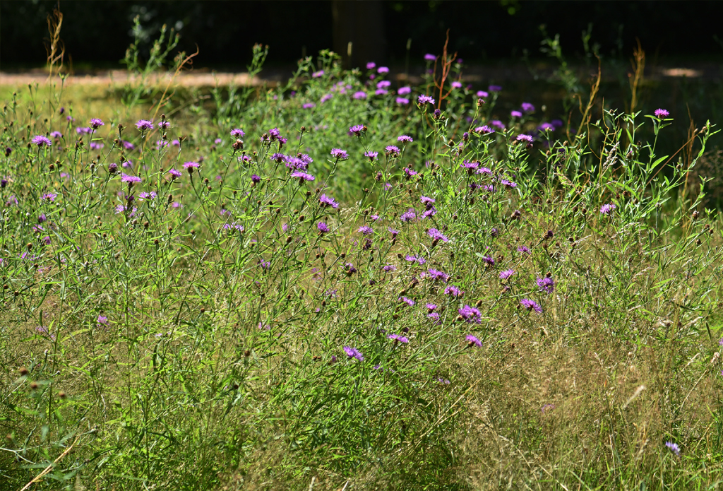 Mittlerweile hat sich die Fläche 1 gut entwickelt. Von Mai bis September blühen auf ihr viele verschiedene heimische Wildblumen. Gräser sind kaum vertreten. Acker-Witwenblumen mit ihren hell-lila Blütenköpfchen, gelb blühendes Echtes Labkraut, auch Margeriten und die charaktervollen Stauden des Blauen Natternkopfs, überall dazwischen zarte rosa Heide-Nelken, Thymian und einiges mehr. Eine wahre Augenweide und ein Paradies für Insekten! Gemäht wird nur ein- bis zweimal im Jahr, um die Nahrungsgrundlage für Wildbienen, Schwebfliegen, Schmetterlinge und zahlreiche weitere Insekten möglichst lange zu erhalten. Durch Mahdgut-Übertragung und Veränderung der Mahd-Intervalle auf dem angrenzenden Areal hat sich die Wildblumenwiese inzwischen ausgedehnt und in der Fläche verdoppelt. Das Schnittgut wird anschließend abgetragen, um den Boden weiter abzumagern. Denn die meisten Wildblumen mögen sandige, wenig humusreiche und nährstoffarme Böden. Auf nährstoffreichen Böden würden sie von dominanteren, schneller wachsenden Pflanzen verdrängt. Die Information der Öffentlichkeit soll weiter forciert werden.