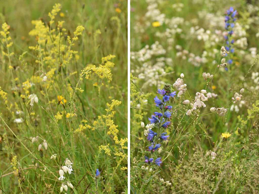 Gelb blühendes Echtes Labkraut (Galium verum), Blauer bzw. Gewöhnlicher Natternkopf (Echium vulgare) und weißes Taubenkropf-Leimkraut (Silene vulgaris).