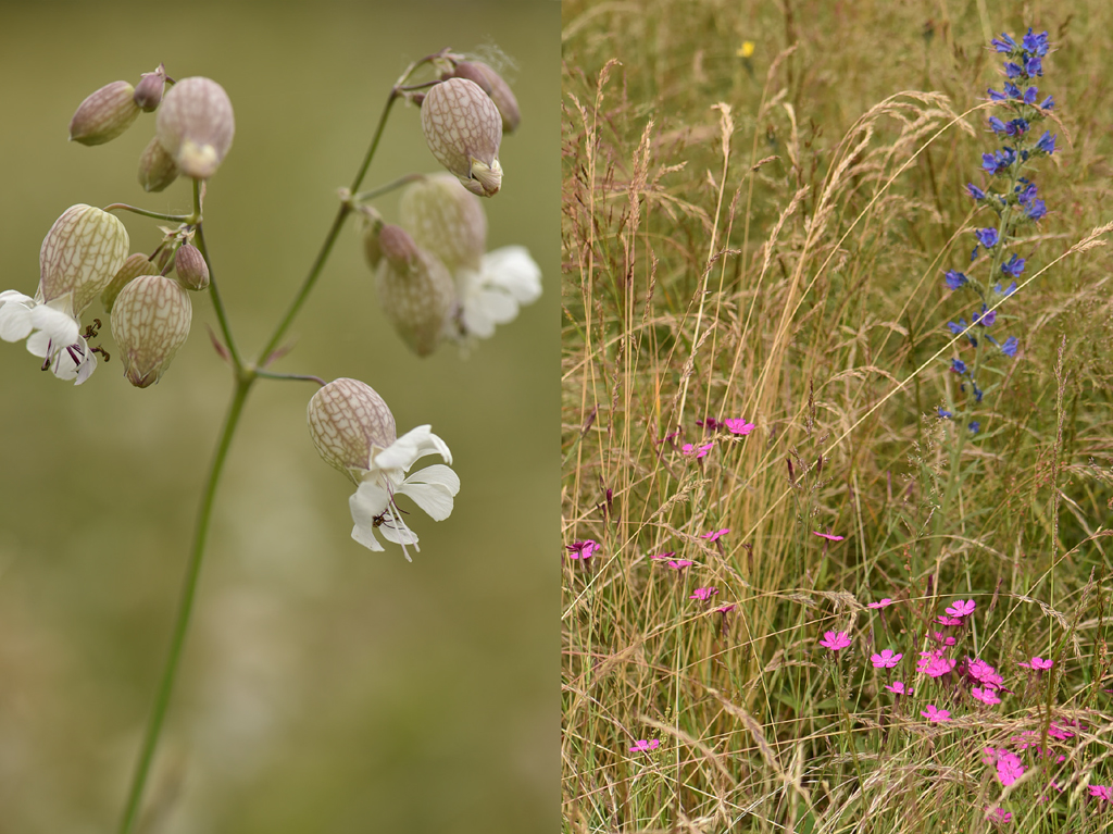 Weiße Blüten des Taubenkropf-Leimkrauts (Silene vulgaris), rosa blühende Heide-Nelken (Dianthus deltoides) und Blauer Natternkopf (Echium vulgare) zwischen sommerlichen Gräsern.