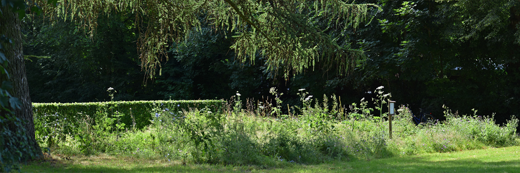 Überquert man die Goethestraße und spaziert am Rövekamp-Spielplatz vorbei in Richtung Wagenfeldstraße, kommt man zu einer kleinen Wildblumenwiese von etwa 50 Quadratmetern. Morgens wird sie von einer mächtigen Lärche beschattet. Sie ist die älteste, etwa 2016 vom Bauhof angelegte naturnahe Fläche und bietet ganz andere Blühaspekte. Wildpflanzen-Stauden wie die Gemeine Wegwarte, der Wiesen-Bärenklau (nicht zu verwechseln mit dem gefährlichen Riesen-Bärenklau bzw. Herkulesstaude), die Schwarze Königskerze und die Wiesen-Flockenblume werden über die Samenreife hinaus bis in den Winter hinein stehen gelassen. So dienen sie Vögeln, zum Beispiel den farbenfrohen Distelfinken, als beliebte Futterquelle. Als Pflegemaßnahme reichte es in den vergangenen Jahren aus, trockene Stängel teilweise zu entfernen.