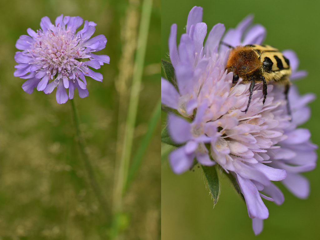 Glattschieniger Pinselkäfer (Trichius gallicus) auf Acker-Witwenblume (Knautia arvensis).