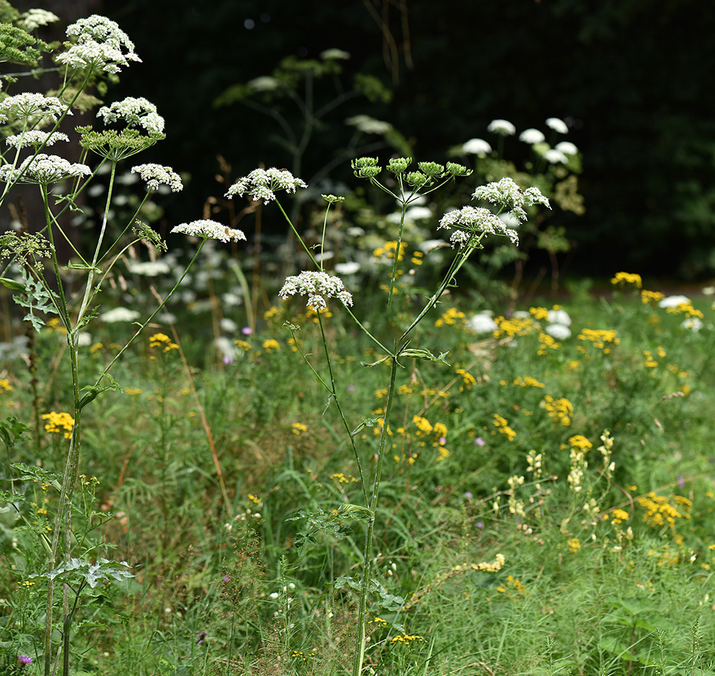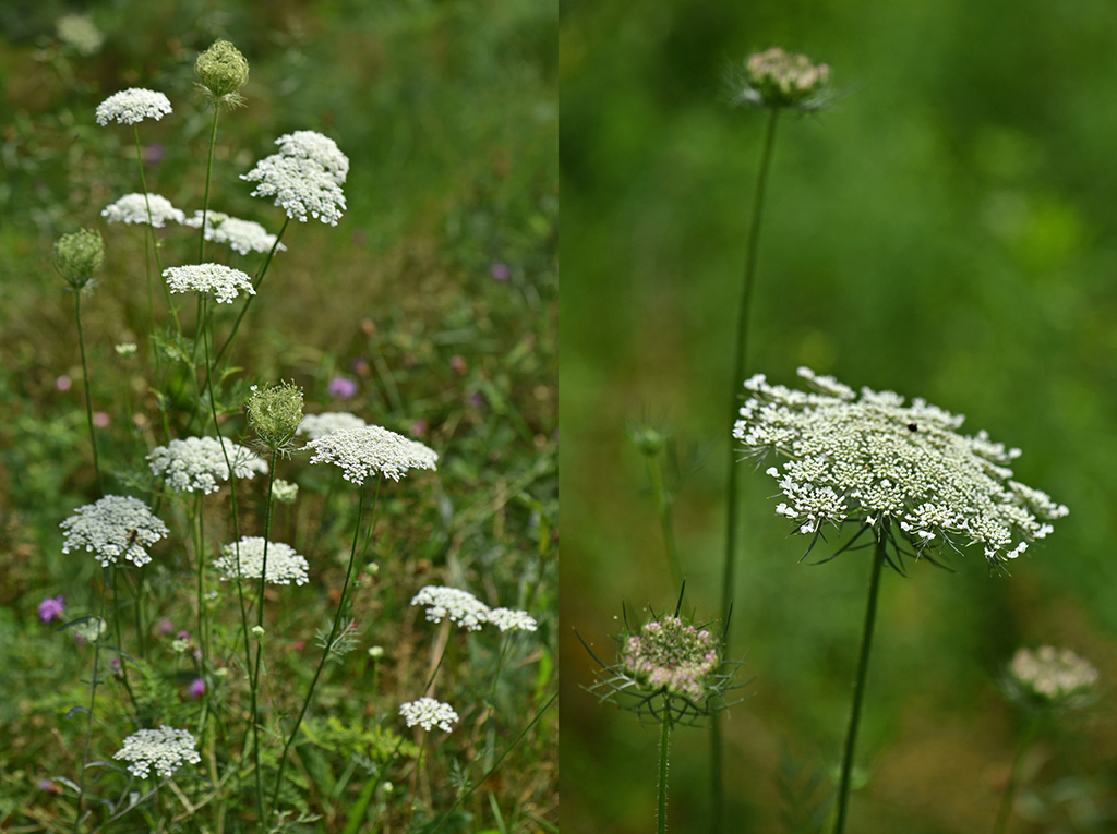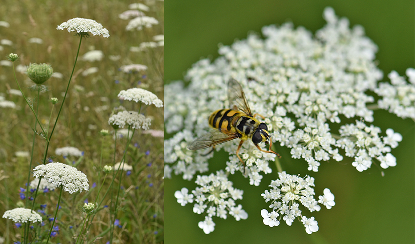 Blühaspekte mit Wilder Möhre (Daucus carota subsp. carota) im August 2024. Rechts mit Totenkopf-Schwebfliege, auch Gemeine Dolden-Schwebfliege genannt (Myathropa florea).