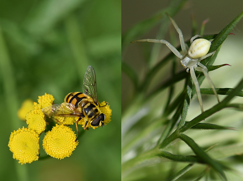 Totenkopf-Schwebfliege (Myathropa florea) auf Rainfarn (Tanacetum vulgare). Anhand der markanten gelb-schwarzen Musterung auf dem Thorax lässt sich diese Schwebfliegen-Art gut bestimmen. Veränderliche Krabbenspinne (Misumena vatia), eine Meisterin der Tarnung. Die Weibchen können ihre Farbe aktiv wechseln.