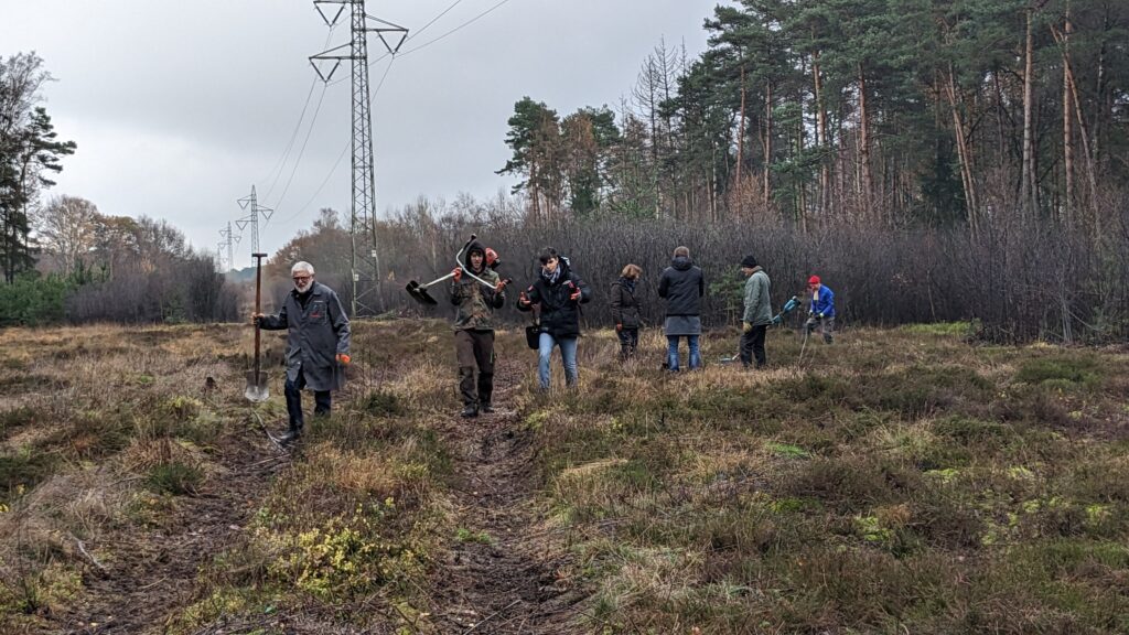 Im Winter 2022/2023 haben wir begonnen die Heidefläche zu bearbeiten. Als erste Maßnahme wurde die Fläche von Kiefernschösslingen befreit. Parallel dazu wurden massive Grasbüschel teilweise entfernt und Teile der Heide gemäht um einer Verholzung entgegen zu wirken. So ganz nebenbei haben wir einige kleine Freiflächen geschaffen, in denen sich jetzt erdnistende Wildbienenarten ansiedeln können.