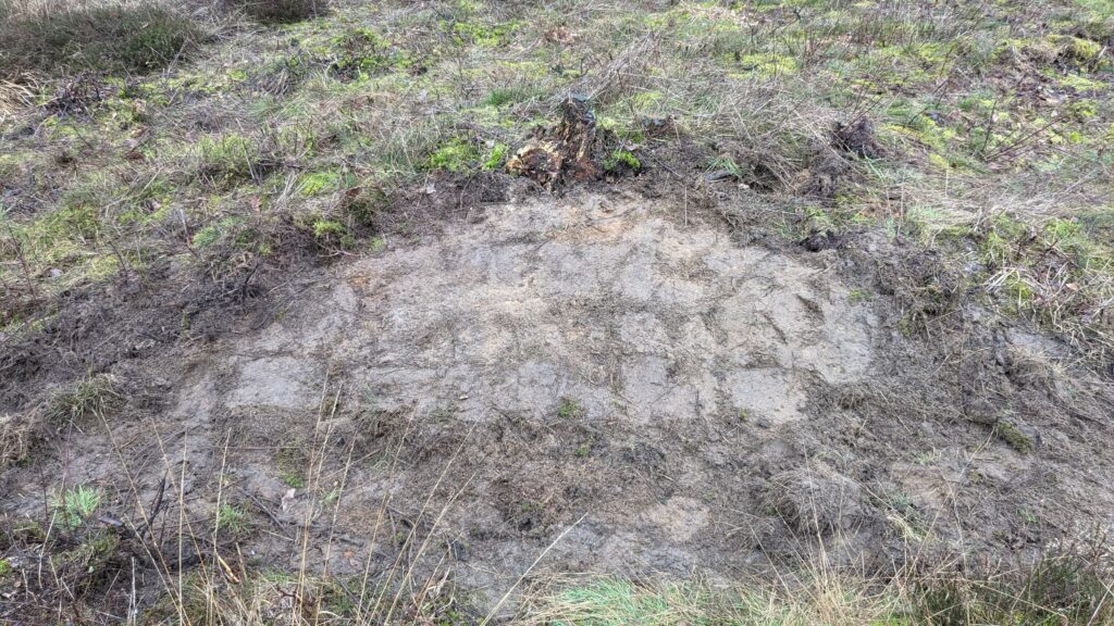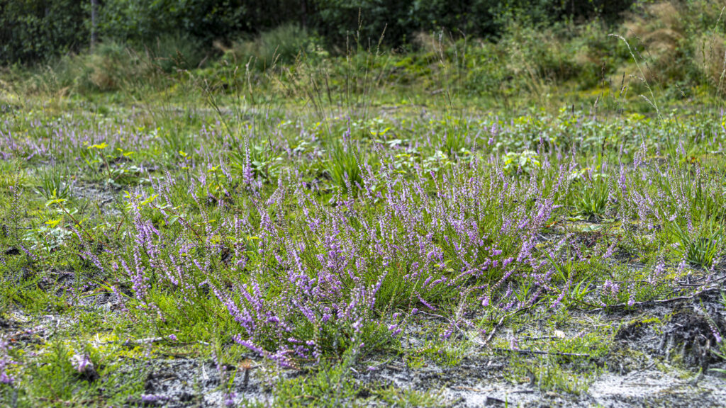 Die 2022 abgeschobene Fläche entwickelt sich prächtig. Die ersten neuen Pflänzchen der Besenheide stehen schon in Blüte im August 2025.