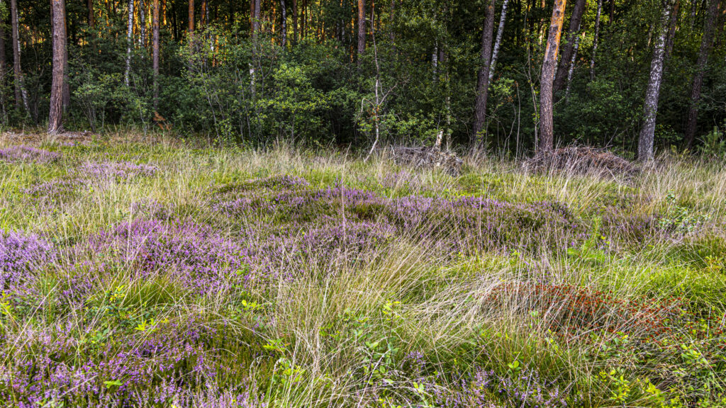 Heideblüte Sommer 2025 – noch mit Pfeiffengras und Baumschößlingen durchsetzt