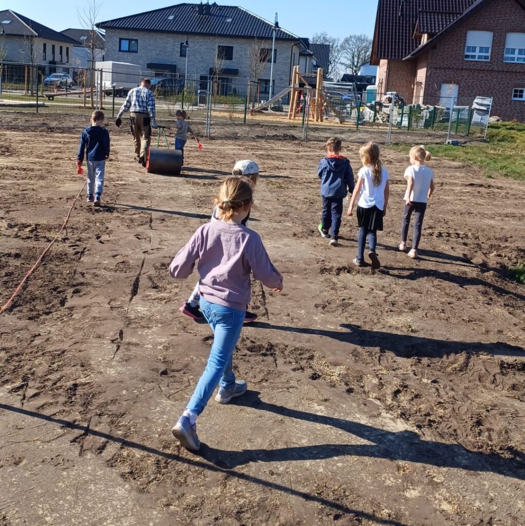 Die „Schulkinder“ der KiTa „Himmelszelt“ haben die Einsaat übernommen. Im Vorfeld wurde den Kindern erklärt, warum die Einsaat mit diesem speziellen Saatgut so wichtig ist. Wenn die Pflanzen aufgegangen sind und blühen, dann bilden sie eine große Fläche mit Nahrung für viele unserer Insekten wie Schmetterlinge, Wildbienen, Fliegen, Heuschrecken und auch für viele andere kleine Tiere. Die Pflanzen bieten zugleich auch Schutz vor Fressfeinden und sind auch ein Rückzugsort für die Überwinterung.